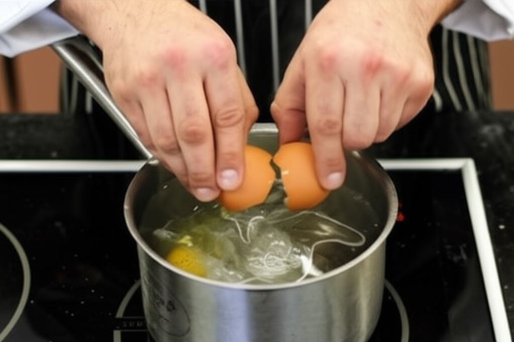 Teraz przygotuj jajko w koszulce. Wbij je nad garnkiem z wodą i gotuj przez około 3-4 minut.