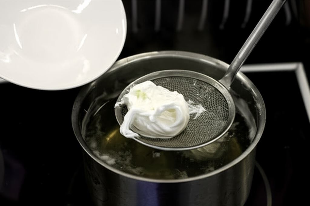 W międzyczasie doprowadź do wrzenia litr wody. Wsyp szczyptę soli i dodaj ocet. Woda powinna się delikatnie gotować, nie wrzeć gwałtownie.