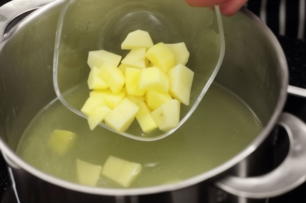 Obierz kartofle, pokrój je w kostkę i wsyp do odcedzonego bulionu.