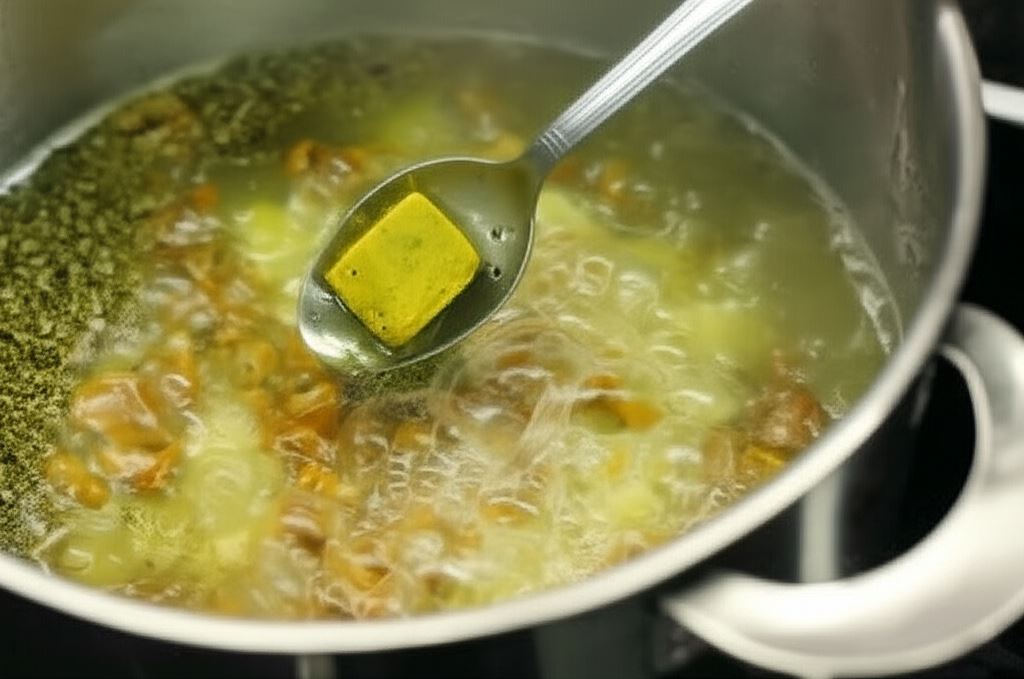 Oczyść kurki, następnie wrzuć je do wywaru razem z kostkami rosołowymi Knorr i majerankiem. Gotuj wszystko aż ziemniaki staną się miękkie.