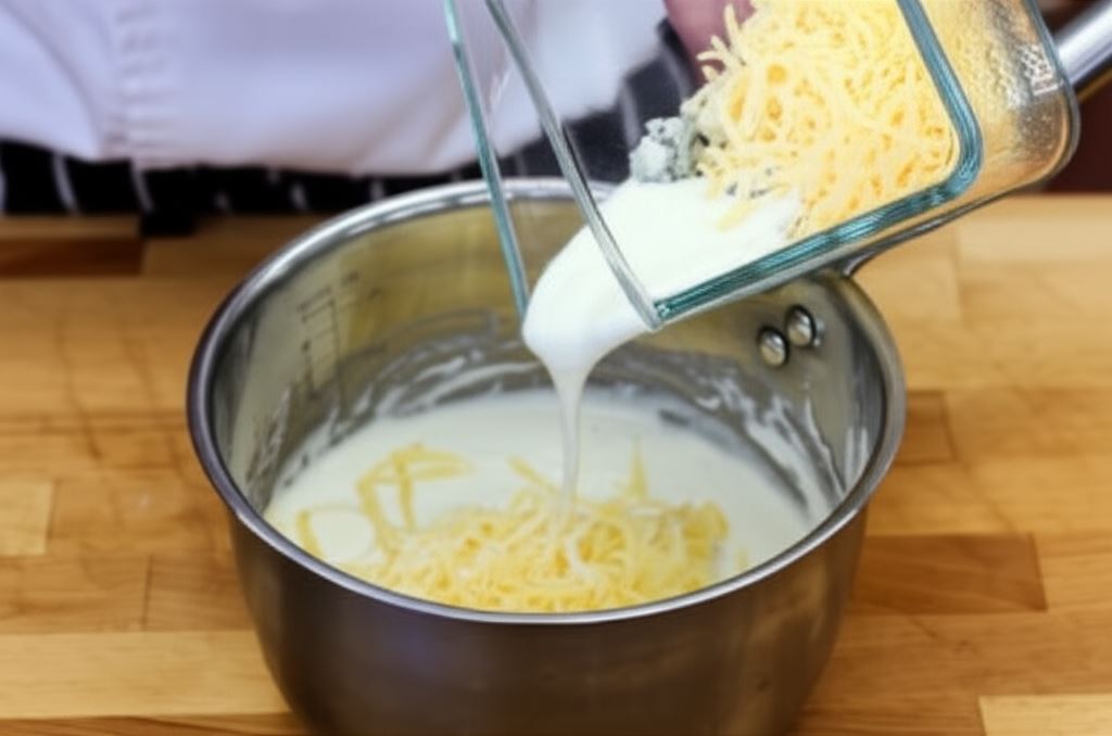 Wsyp do sosu starty ser żółty i pocięte na drobniejsze kawałki pozostałe sery.