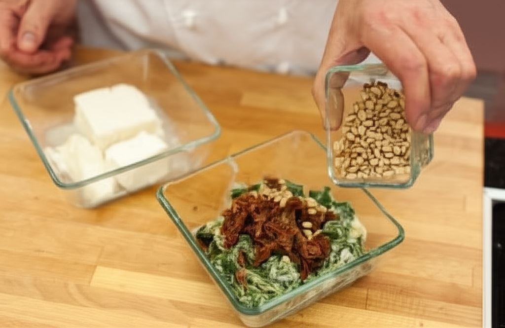 Do szpinaku wsyp pokrojone suszone pomidory i uprażone orzechy. Mieszankę wystudź i dodaj pokrojony w drobną kostkę ser feta. Przygotowaną masę wlej do płaskiego naczynia i umieść w zamrażarce.