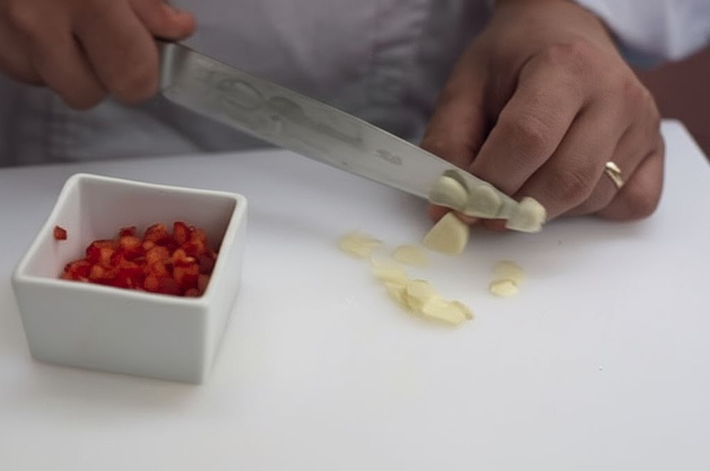 Ząbki czosnku pokrój na bardzo cienkie plasterki. Chilli oczyść, przepłucz i wyciągnij nasiona. Strąk posiekaj na drobne kawałki.