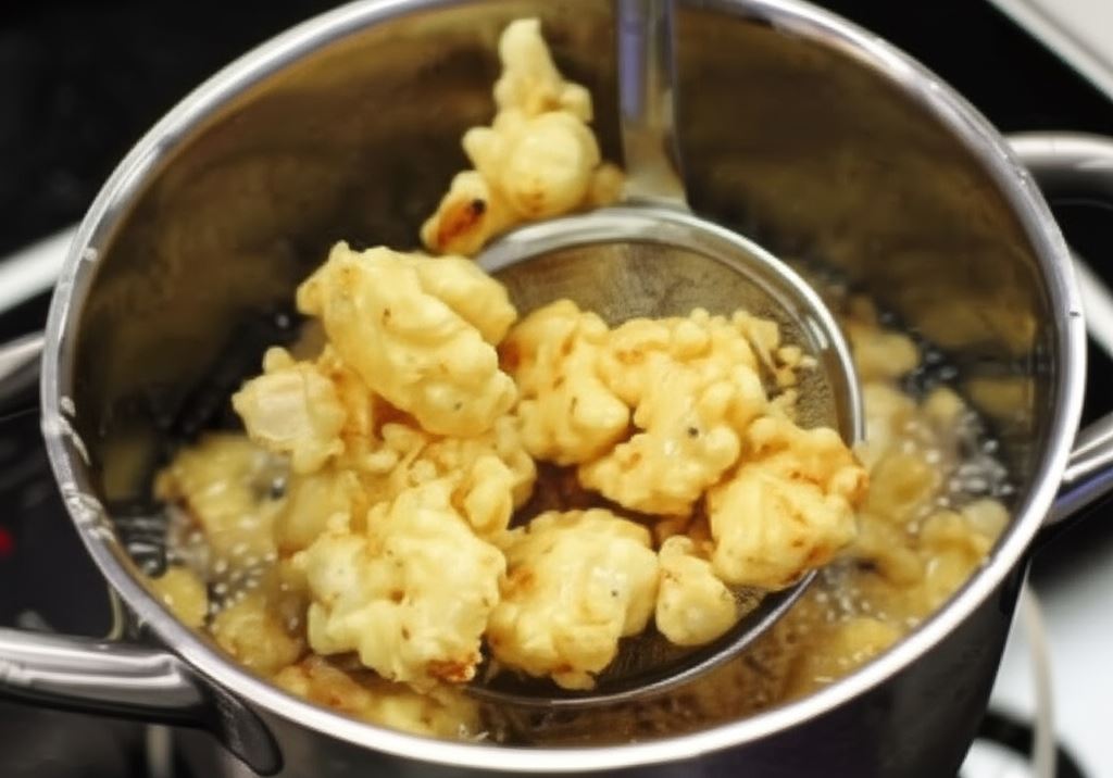 Krewetki zanurz w przygotowanym cieście i wrzucaj na rozgrzany olej.
