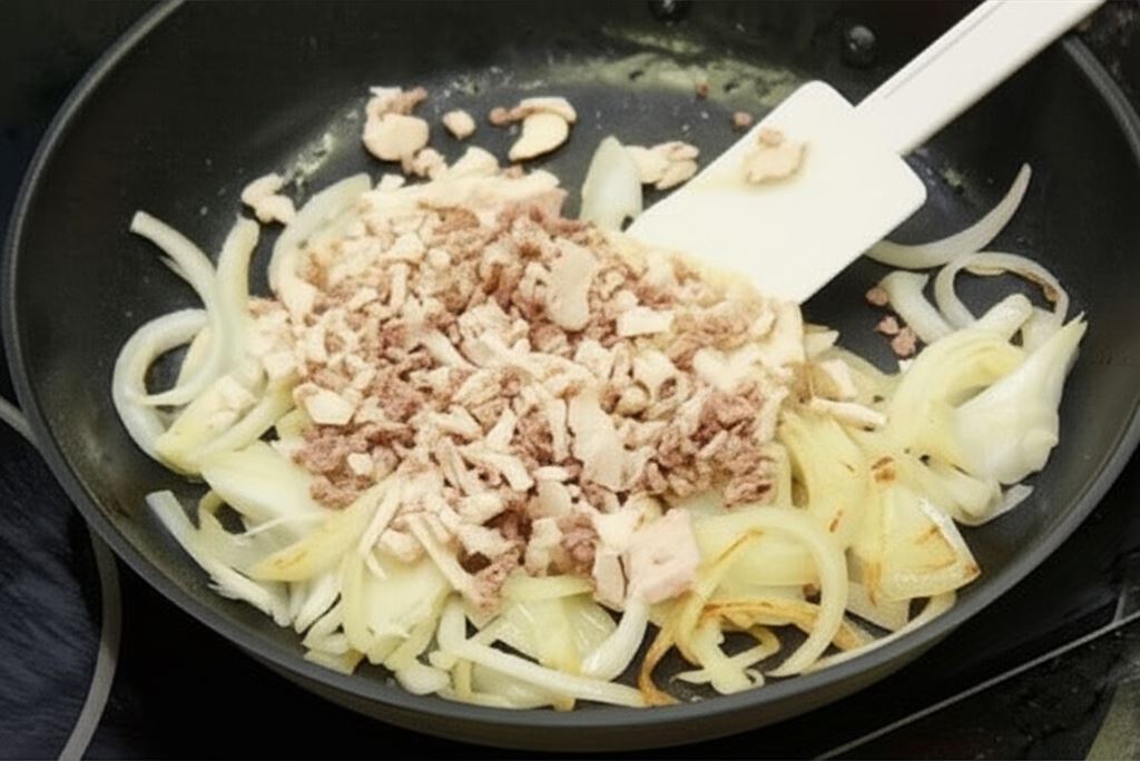 Potem zrumień cebulę na maśle, wsyp mięso z rosołu i zamieszaj.