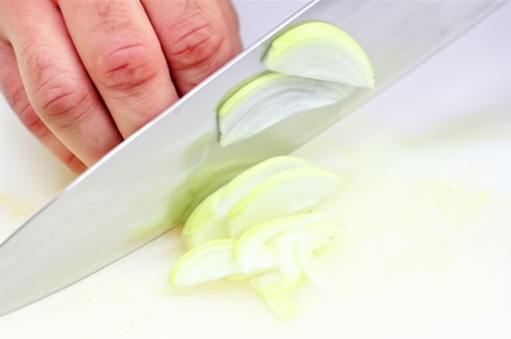 Cebule posiekaj w piórka. Na patelni podgrzej dwie łyżki oleju.