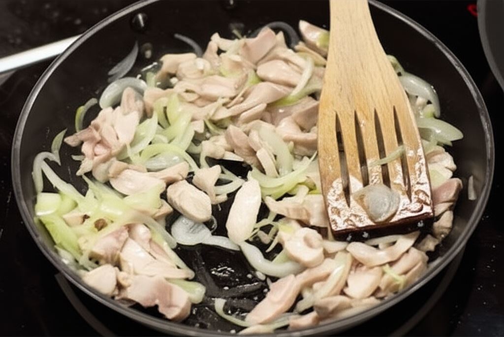 Przyrumień cebulę, drobno pokrojone grzyby i mięso bez kości z rosołu. Wsyp kostkę Rosołu z kury Knorr i mieszaj do całkowitego rozpuszczenia. Podduś mięso przez moment. Potem zmiel wszystko w maszynce, aby uzyskać gładką masę.