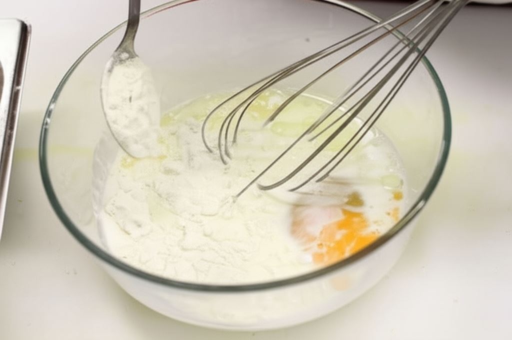 Sporządź ciasto na naleśniki. Połącz mleko z jajkami, dwoma łyżkami oleju, solą i mąką.