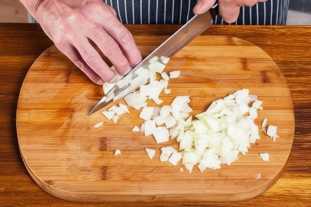 Cebulę posiekaj w kostkę i zrumień na złocisto używając oleju.