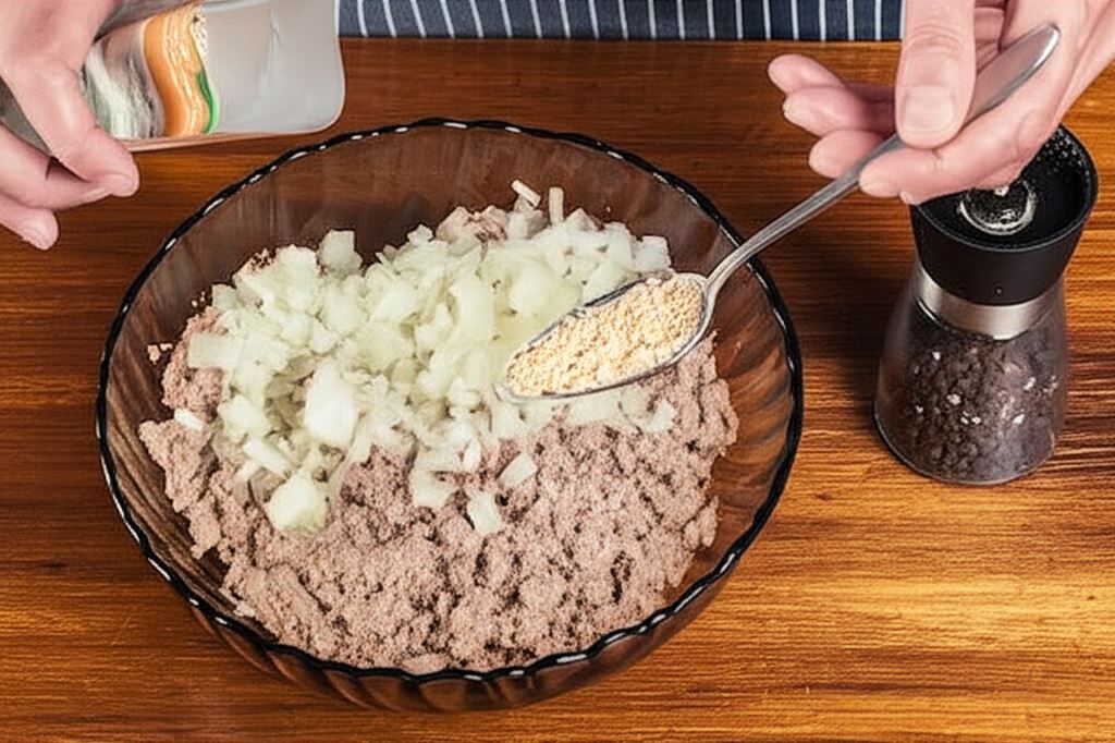 Mięso z rosołu przemiel, dołącz do niego cebulę, Cebulę z USA Knorr, świeżo mielony pieprz i starannie wymieszaj farsz.