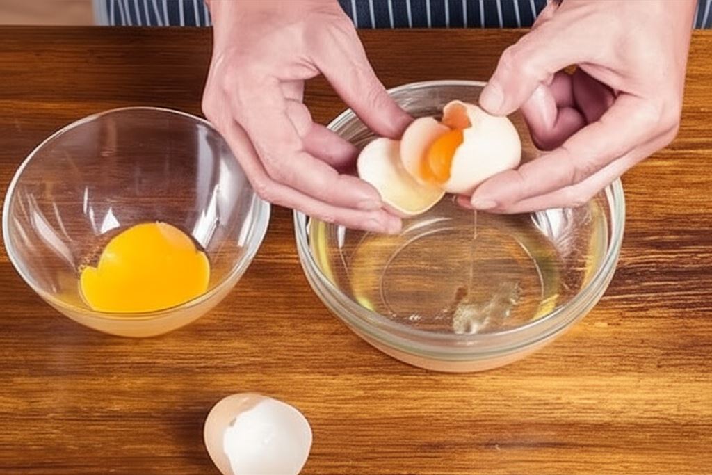 Rozdziel żółtka od białek i umieść w osobnych miseczkach, następnie do białka wsyp szczyptę soli i ubij przy użyciu miksera na sztywną pianę.