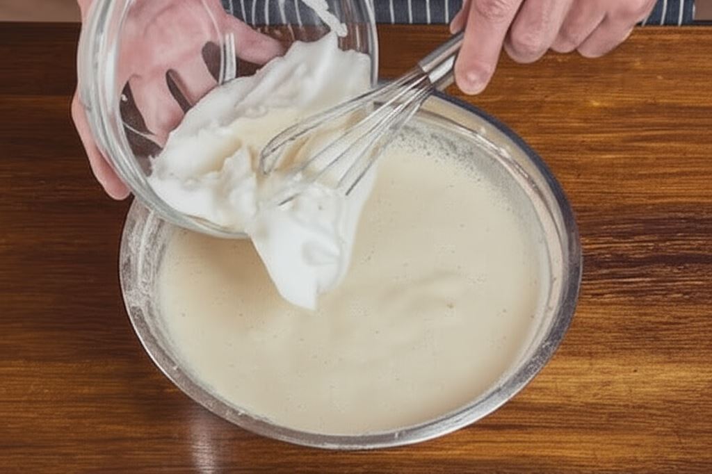 Do żółtka wsyp cukier, zamieszaj, połącz z mlekiem, mąką i stopniowo dodawaj ubite białko, a następnie na rozgrzanej patelni do naleśników smaż naleśniki.