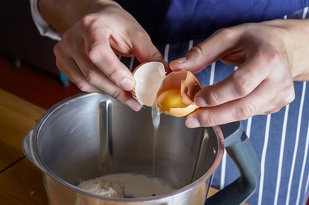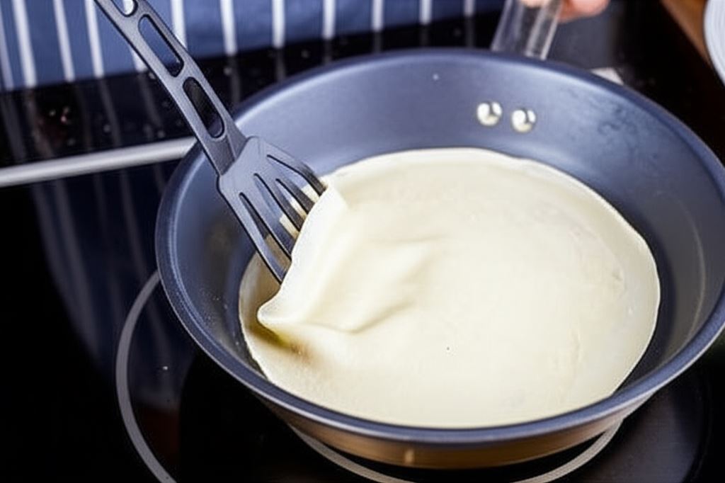 Mąkę pszenną wymieszaj z mlekiem, jajkami i odrobiną soli, aby uzyskać tradycyjne ciasto na naleśniki.