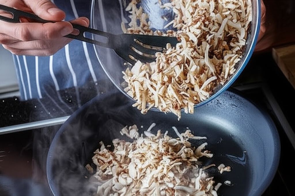 Pieczarki zetrzyj na tarce z dużymi oczkami i smaż na patelni z dodatkiem oleju.