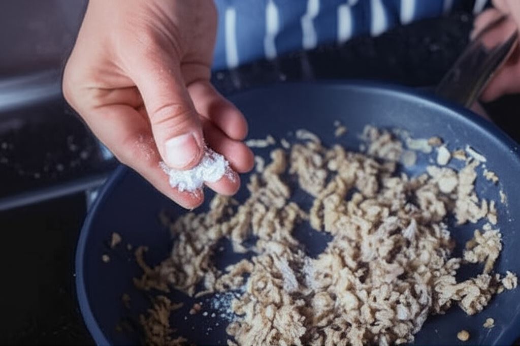 Wsyp do pieczarek odrobinę soli i smaż do momentu, aż odparuje cała woda i pieczarki staną się bardzo ciemne.