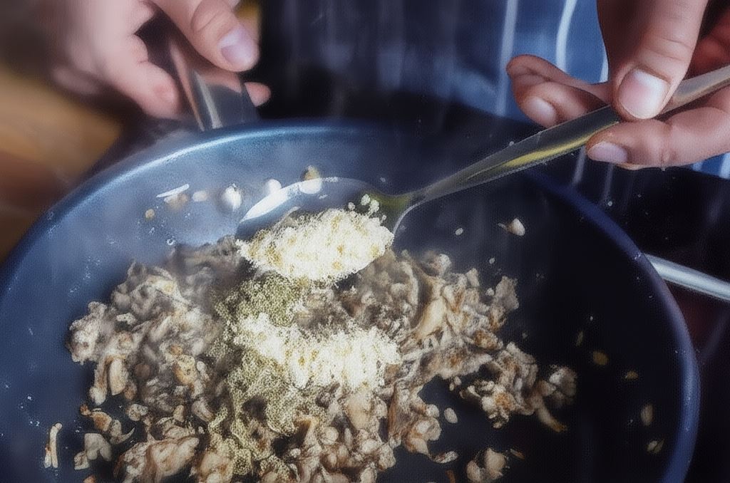 Przy końcu smażenia wsyp przyprawy i smaż do momentu, aż pieczarki staną się odpowiednio gęste.