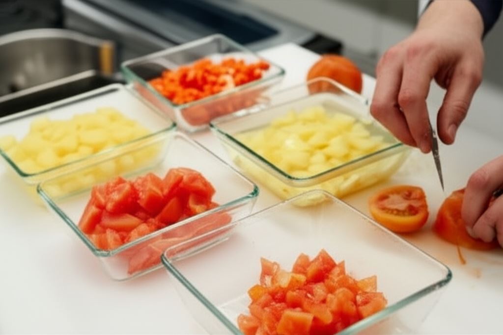 Pomidory oparz i zdejmij skórkę, pokrój w kostkę. Ziemniaki i marchewkę posiekaj w kostkę. Czosnek pokrój na plasterki.