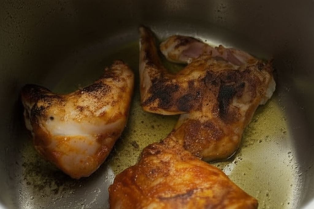 Mięso przysmażaj po wszystkich stronach na patelni. Gdy mięso nabierze rumieńca, przenieś je do rondla.