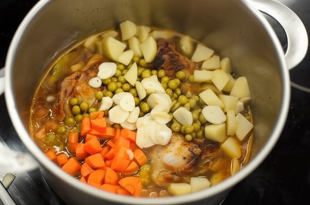 Wrzuć pomidory, liście laurowe, dolej 2 szklanki wody i duś przez 15 minut na małym ogniu. Wsyp ziemniaki, marchewkę i groszek.