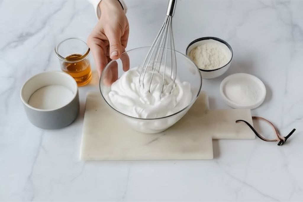Białka ubijamy na sztywną pianę. Dodajemy stopniowo łyżkę cukru i cukier waniliowy, aż uzyskamy lśniącą i sztywną pianę. Następnie wsypujemy budyń oraz powoli wlewamy olej. Nadal delikatnie miksujemy, aby składniki się połączyły.