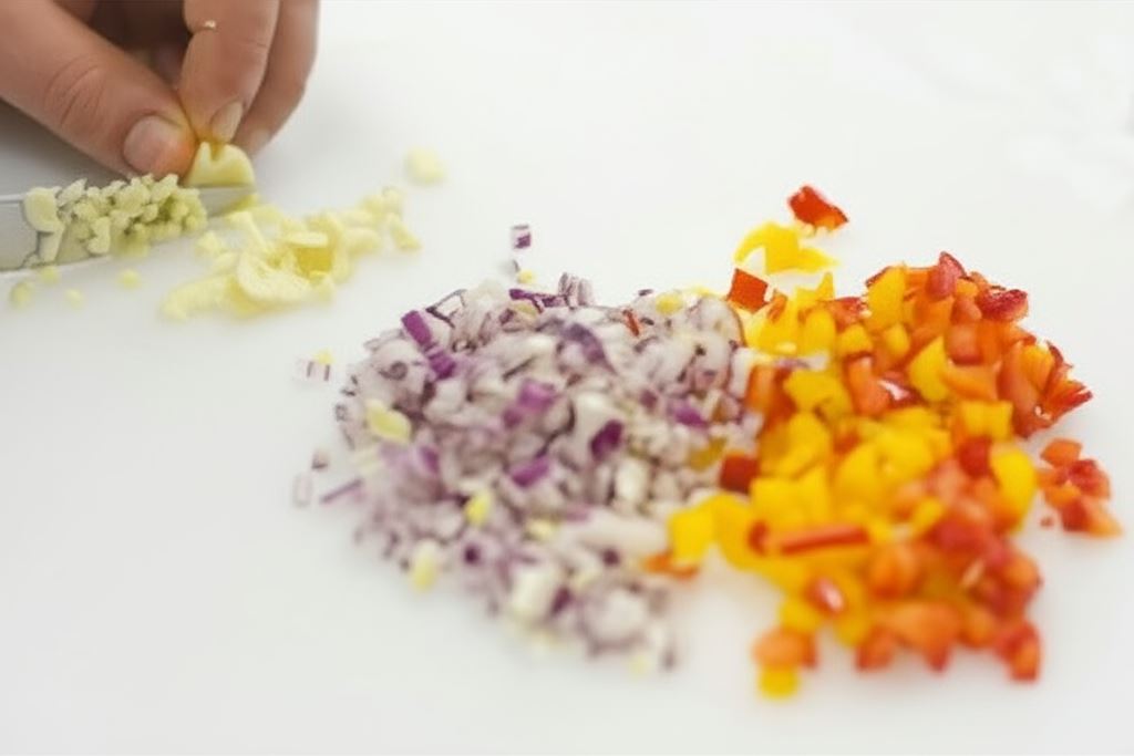Barwne papryki oczyść z gniazd nasiennych, potem pokrój w małą kostkę. Tak samo pokrój cebulę i czosnek. Chilli posiekaj.