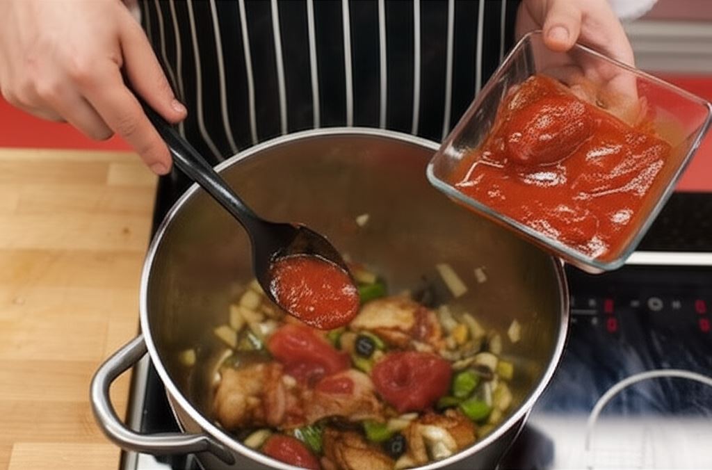 W tym samym garnku zrumień pokrojoną w grubą kostkę cebulę i paprykę, rozdrobniony czosnek, wsyp oliwki i kapary. Umieść w garnku kurczaka. Wszystko zalej pomidorami, gotuj pod przykryciem około 30 minut.