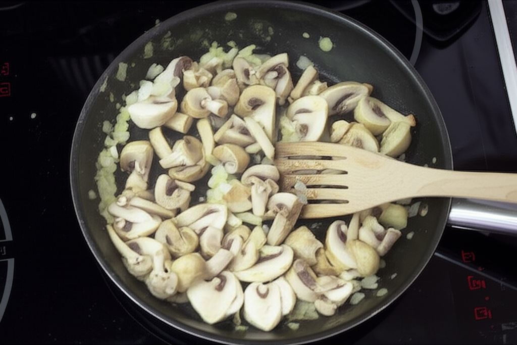 Pieczarki pokrój na kawałki, a cebulę w kostkę. Wszystko podsmażaj.