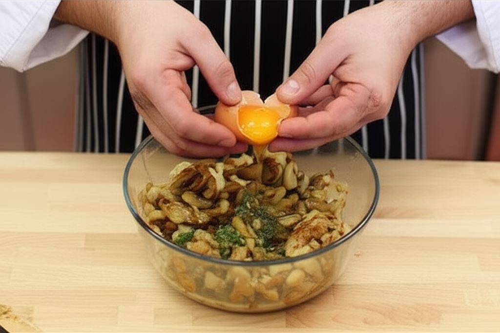 Potem pokrój bułkę w kostkę i połącz z sosem. Dodaj pieczarki, resztę posiekanej natki pietruszki i lubczyk oraz jajko. Wymieszaj starannie farsz.
