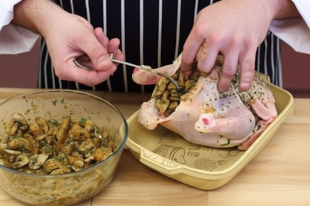 Wypełnij kurczaka farszem i zwiąż go nicią lub połącz wykałaczkami.
