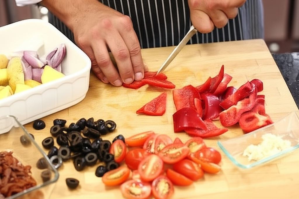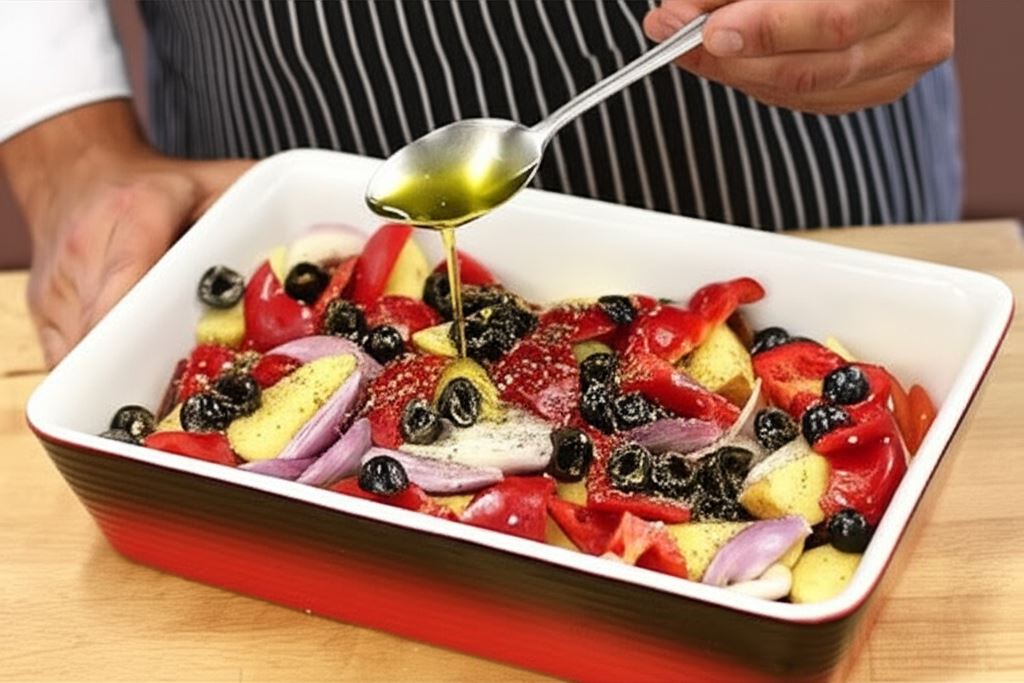 Nagrzej piekarnik do temperatury 180 – 200C. Starannie umyj warzywa. Ziemniaki pokrój w ćwiartki (podgotuj do półmiękka), pomidorki przekrój na połówki, paprykę podziel na niezbyt małe kawałki, cebulę pokrój w ćwiartki, a czosnek drobno posiekaj. Suszone pomidory potnij w paseczki, a oliwki przepołów.