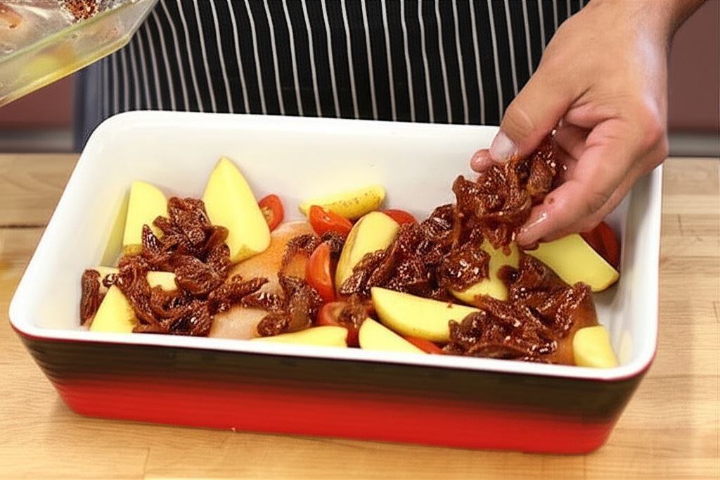 Odkryj smak idealnie upieczonego kurczaka otoczonego kolorową kompozycją warzyw! To danie, które zachwyca nie tylko smakiem, ale również prostotą przygotowania. Soczyste mięso kurczaka, przyprawione aromatyczną mieszanką Knorr, w towarzystwie ziemniaków, pomidorków, papryki i oliwek tworzy harmonijną całość, która zadowoli nawet najbardziej wymagające podniebienia.