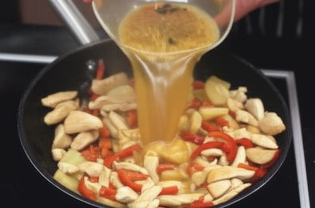 Wymieszaj fix Knorr z 300 ml wody i wlej na patelnię. Gotowe danie podawaj z ryżem. Aby wzbogacić potrawę o delikatnie orzechowy aromat, pod koniec gotowania dodaj kilka kropel oleju z sezamu.