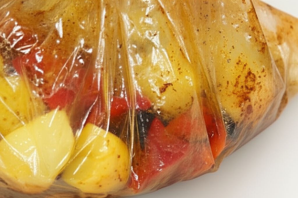 Dodaj warzywa i oliwki do mięsa, po czym przykryj naczynie. Piecz przez około 1 godzinę. Na 15 minut przed końcem pieczenia odkryj naczynie i kontynuuj pieczenie, aby mięso wraz z warzywami stały się lekko chrupiące.