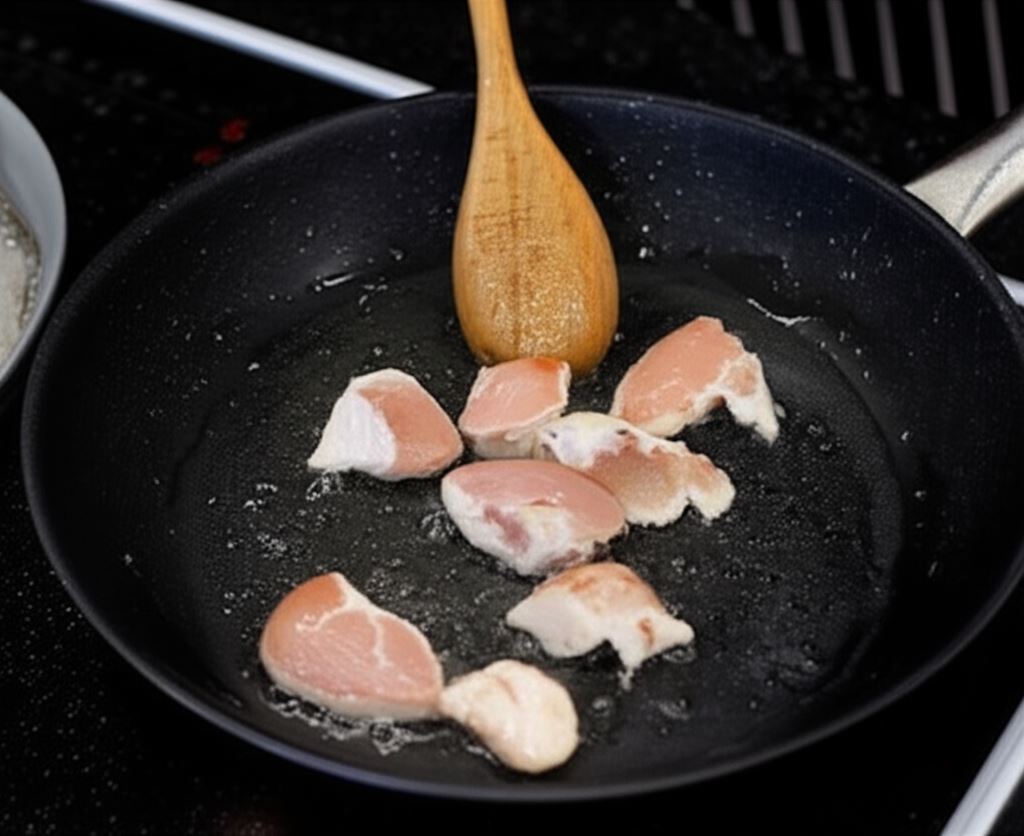 Rozpocznij przygotowanie kurczaka po indyjsku z orzechami od pokrojenia 500 gramów mięsa w kostkę. Potem przygotuj patelnię i rozgrzej na niej łyżkę oleju. Dodaj na nią kurczaka i smaż przez parę minut, aż będzie delikatnie zrumieniony.