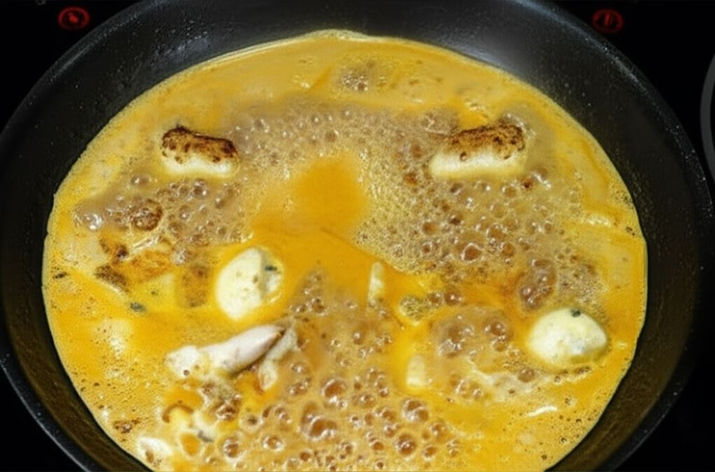 Przelej przygotowany w misce sos na patelnię i połącz go z kurczakiem. Zagotuj i gotuj przez 5 minut na średnim ogniu.