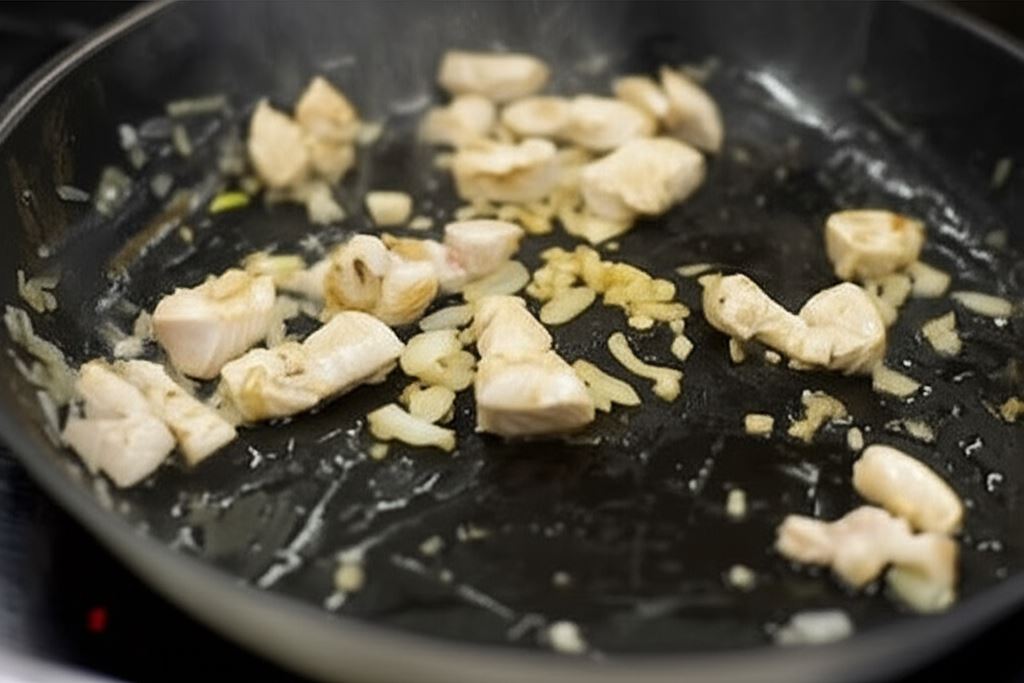 Filety kurczaka oraz cebulę pokrój w kostkę, zrumień w garnku na niewielkiej ilości tłuszczu.