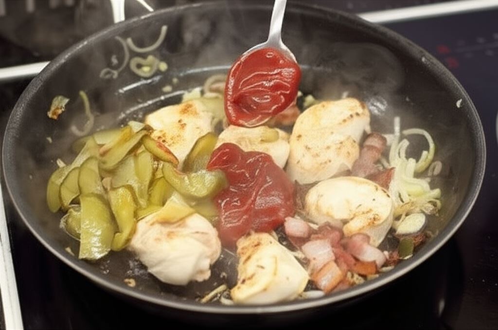 Boczek, ogórek i kurczaka potnij w kostkę, a cebulę w półkrążki. Boczek podsmażaj, dorzuć kawałki mięsa i cebulę. Smaż, aż kurczak się zrumieni. Dodaj ogórek, Ketchup Hellmann's Pikantny, starannie wymieszaj i smaż jeszcze 2 minuty.