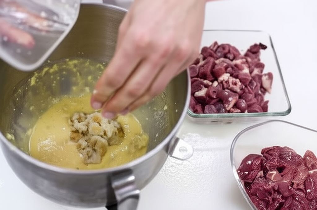 Rozdziel żółtka od białek. Masło utrzyj razem z żółtkami, dodaj namoczoną w mleku i odciśniętą bułkę, roztartą wątróbkę oraz drobno posiekane serce.