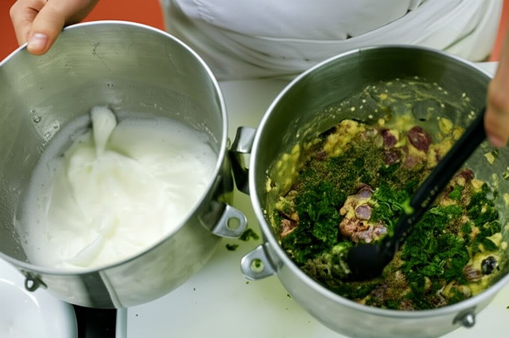 Wytrzep białka na pianę. Nadzienie połącz z posiekaną natką pietruszki, ubitym białkiem, solą i majerankiem.