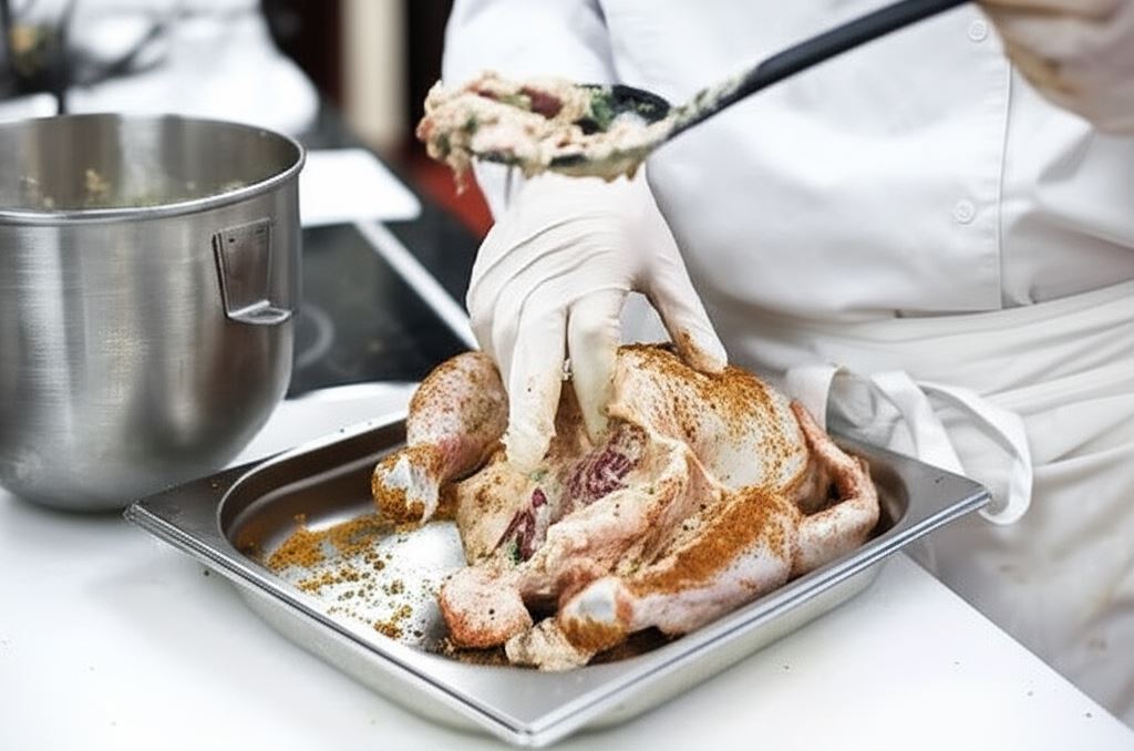 Skrapianie kurczaka zimną wodą podczas pieczenia to stary kulinarny trik, który pomaga uzyskać idealnie chrupiącą i złocistą skórkę. Dla ułatwienia pracy warto też wykorzystać gotową mieszankę przypraw z pieprzem kajeńskim, rozmarynem i kolendrą, która podkreśli smak mięsa.