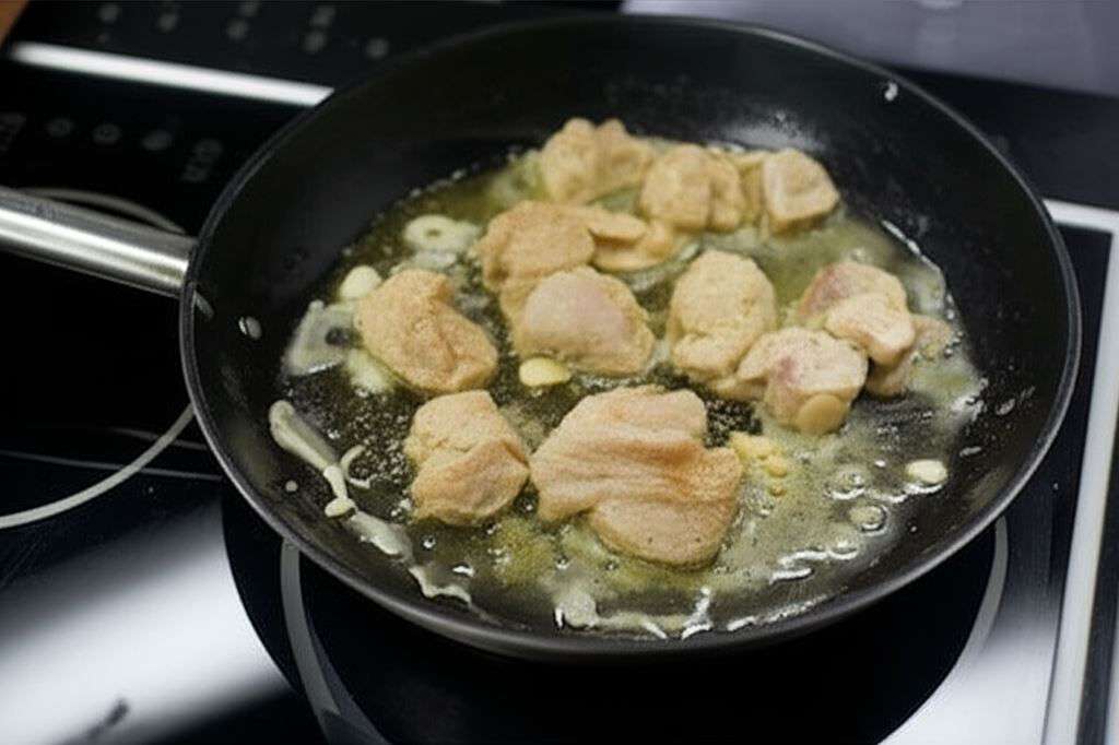 Podgrzej olej w woku, wrzuć czosnek pokrojony w plasterki, kawałki kurczaka i smaż całość, aż mięso nabierze złotego koloru.