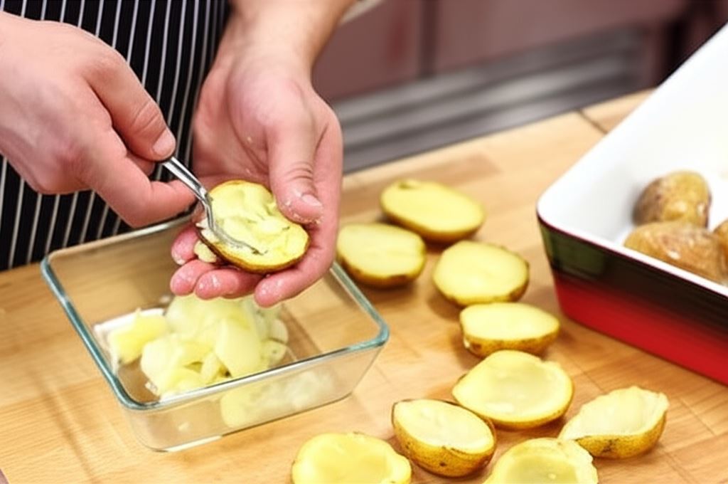 Ziemniaki opłucz, wysusz, posmaruj z zewnątrz olejem. Włóż do rozgrzanego do 180°C piekarnika na około ok. 45 minut. Kiedy staną się miękkie, ostudź je. Przetnij na połówki i wydrąż środek, zachowując skórkę i miąższ.