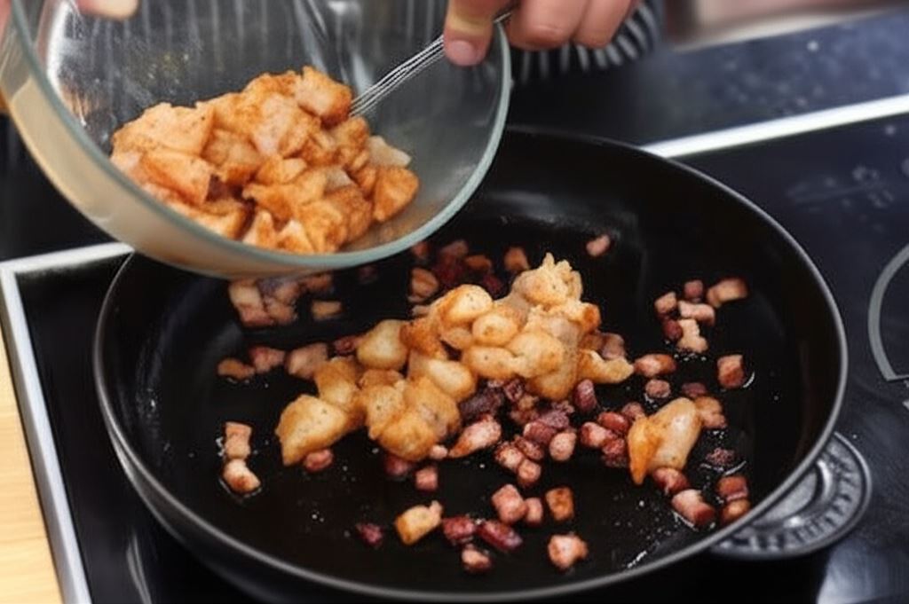Boczek pokrój w kostkę i smaż na patelni aż tłuszcz się wytopi. Zbędny tłuszcz odlej z patelni, dodaj pokrojone piersi. Obsmaż je tylko krótko, aby pozostały jeszcze surowe wewnątrz.