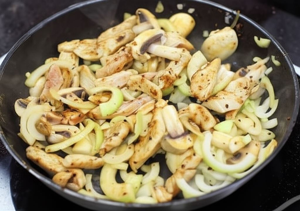 Zrumień mięso na oleju, wsyp pokrojone pieczarki i cebulę. Smaż przez kilka minut.