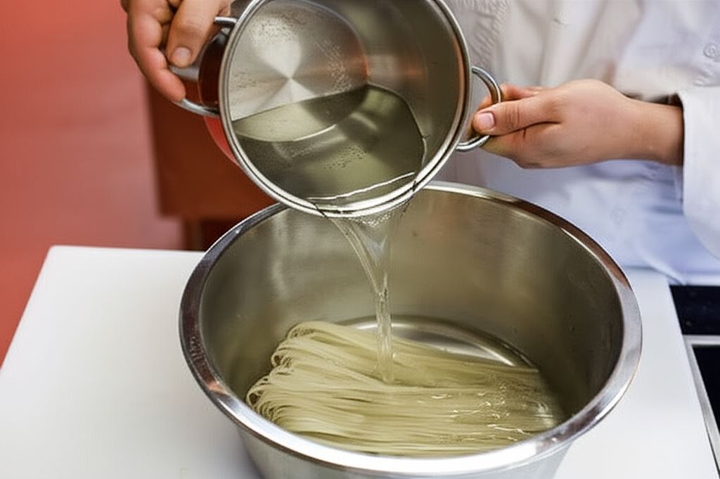 Makaron zalej wrzącą wodą i odcedź po około 3 minutach.