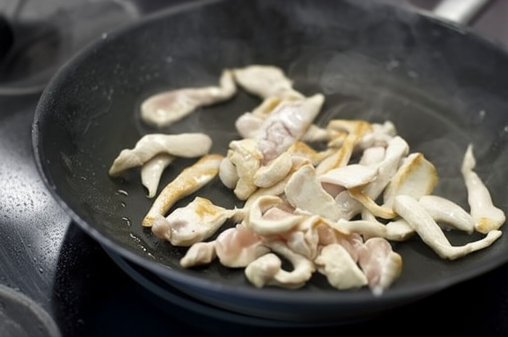 Mięso potnij w paski i wrzuć na gorący olej. Obsmaż i odłóż.