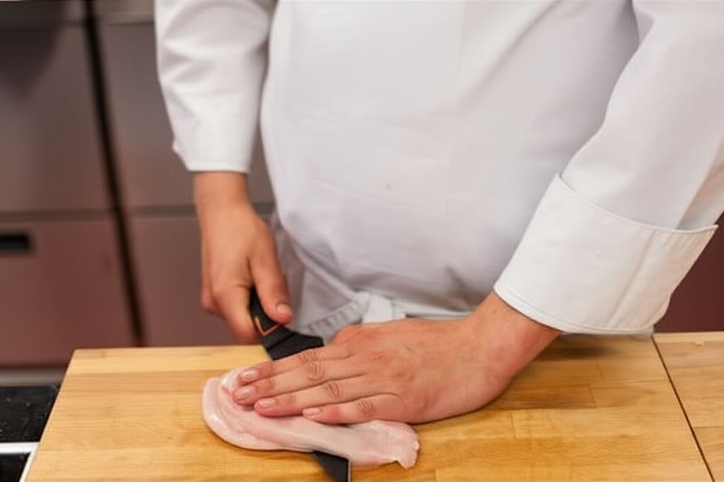 Pierś mięsa przekrój na pół wzdłużnie, lekko rozbij i posyp przyprawą Knorr.