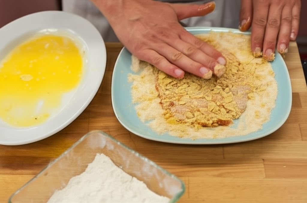 Panieruj mięso po kolei w mące, rozbitym jajku i bułce tartej zmieszanej z płatkami kukurydzianymi.
