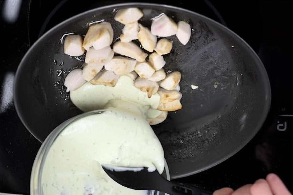 Podsmaż na rozgrzanym tłuszczu piersi kurczaka pokrojone w kostkę. Smaż kurczaka do momentu lekkiego zrumienienia.