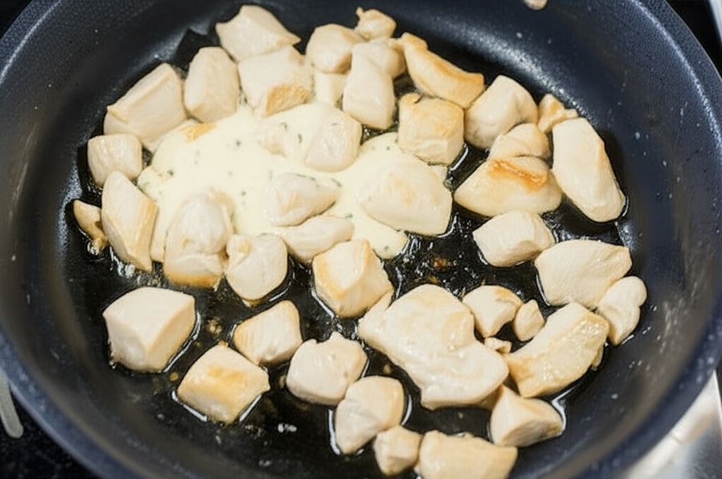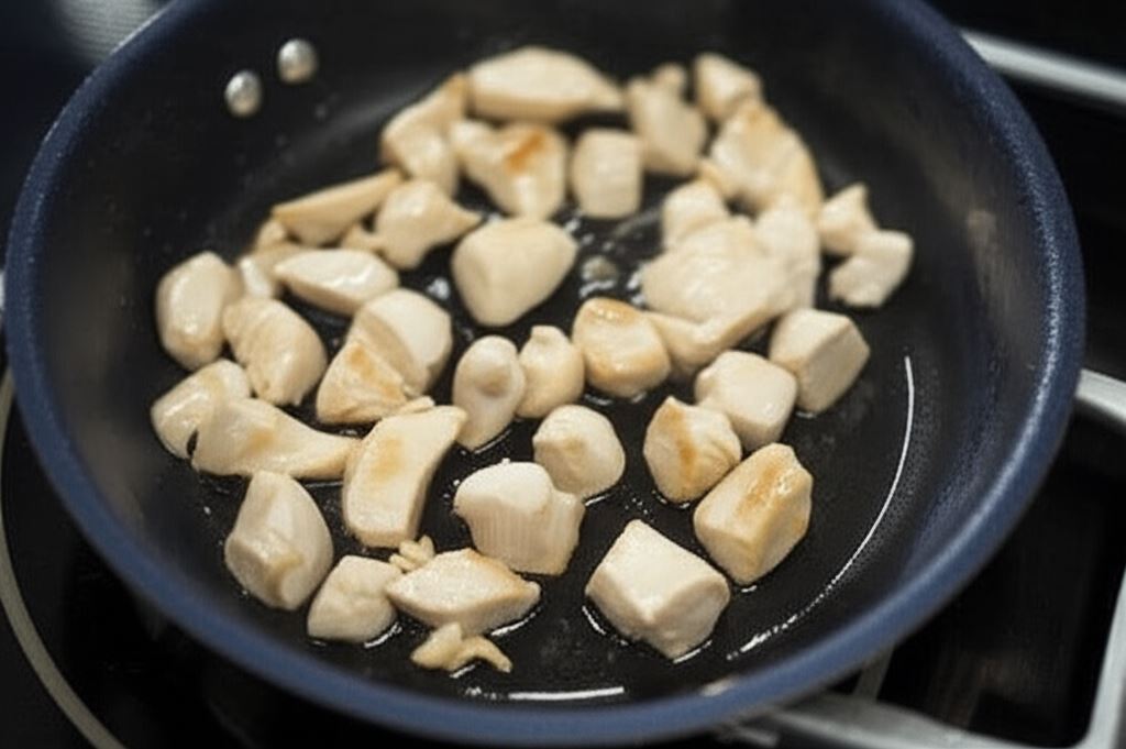 Pierś kurczaka oczyść z błonek, podziel na parę części, a potem pokrój w małą kostkę. W oddzielnym garnku ugotuj wybrany dodatek do dania np. makaron większego rozmiaru (kokardki, tagliatelle) albo ryż biały, według wskazówek zamieszczonych na opakowaniu. Na patelni rozgrzej małą ilość oleju (około 1 łyżki). Kiedy tłuszcz będzie gorący, umieść kurczaka i często przewracając, zrumień na złoto z każdej strony.